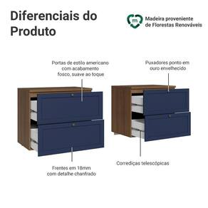 O acabamento de alta resistência da estrutura é no tom amadeirado Rustic e das frentes em Azul, possuindo uma textura suave ao toque. O destaque fica por conta dos puxadores ponto em ouro envelhecido, feitos com metal resistente, trazem personalidade e um charme único. O detalhe chanfrado das frentes forma molduras delicadas e atemporais.