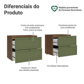 O acabamento de alta resistência da estrutura é no tom amadeirado Rustic e das frentes em Verde, possuindo uma textura suave ao toque. O destaque fica por conta dos puxadores ponto em ouro envelhecido, feitos com metal resistente, trazem personalidade e um charme único. O detalhe chanfrado das frentes forma molduras delicadas e atemporais.