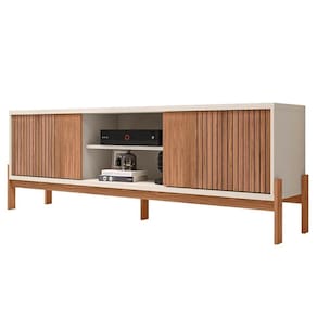 Eleve o conceito de estilo e funcionalidade na decoração da sua sala de estar com o Rack Para Sala Bancada de 72 Pol Ripado 184cm Tannen Freijó/Off White, da Caemmun.