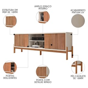 Esse imponente rack moderno, especialmente desenhado para TVs de até 72 polegadas, é a união perfeita entre estética e praticidade. Fabricado com materiais de alta qualidade como MDP e MDF, oferece durabilidade e um acabamento primoroso onde se destacam as portas ripadas em baixo relevo e os pés estilo cavalete que conferem uma distinção única ao produto. Já o interior espaçoso com dobradiças metálicas acomoda diversos itens, ao passo que os nichos comportam os seus dispositivos eletrônicos enquanto mantém a organização dos fios, garantindo assim um ambiente clean e convidativo para aproveitar cada segundo de seus programas favoritos ao lado de quem você ama.