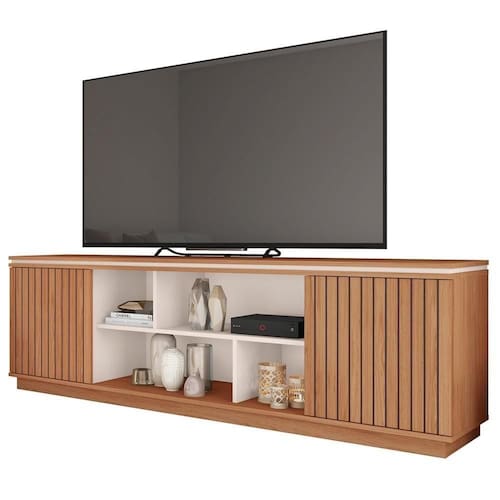 Descubra a harmonia perfeita para o seu refúgio de lazer com o Rack Para Sala Bancada de 75 Pol 180cm Simetria Freijó/Off White, da Caemmun.
