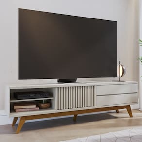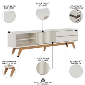 Características do Produto Material da estrutura: MDP 15mm/MDF 25mm e 15mm/HDF 3mm. Acabamento: Pintura UV. Escala de Brilho: Fosco. Peso Suportado: 49 kg distribuídos. Ideal para TV de até: 75 polegadas. Quantidade de Portas: 1 Porta. Tipo de Porta: De Correr. Possui Puxadores: Não. Quantidade de Gavetas: 2 Gavetas. Tipo de Corrediças: Telescópicas. Quantidade de Prateleiras: 1 Prateleira. Quantidade de Nichos: 2 Nichos. Possui Pés: Sim. Material dos Pés: Madeira Maciça. Possui Passa Fios: Sim. Diferenciais: - Design moderno. - Detalhe ripado na lateral. - Pés de madeira maciça com 20cm de altura. - Porta ripada deslizante. - Base e tampo com 25mm de espessura para maior resistência e durabilidade. Sistema de Montagem: Parafusos/Cavilhas/Minifix. Manual de Montagem: Sim. Complexidade da Montagem: Média. Volumes: 2 Volumes. Conteúdo da Embalagem: 1 Rack. Garantia do Fabricante: 90 dias contra defeito de fabricação. Montagem: Recomendamos que seja feita por um profissional. Recomendação de Limpeza: Utilize pano levemente úmido.