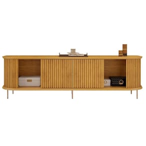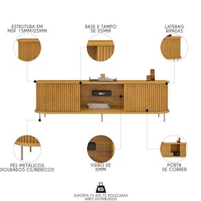 Você vai se apaixonar pelo Rack Para Sala Bancada de 75 Pol 218cm Ripado World D04 Cedro, da Mpozenato um móvel que combina beleza, qualidade e funcionalidade. Ela tem um design moderno e sofisticado, com laterais curvas ripadas que dão um charme especial a Sala de Estar. O tampo e a base são usinados com cantos curvos e bordas chanfradas, seguindo as últimas tendências de decoração. A Bancada Para tem duas portas deslizantes e ripadas, que oferecem um amplo espaço para guardar seus objetos, e o detalhe ripado nas portas dispensa o uso de puxadores. Além disso, ela tem dois nichos para aparelhos eletrônicos, uma prateleira de vidro e um espaço extra para você aproveitar o melhor do entretenimento. Os cabos ficam organizados por trás do produto, graças aos passa-fios que facilitam a limpeza. A bancada é sustentada por pés metálicos cilíndricos na cor dourada, que a elevam do chão e aumentam sua durabilidade e facilita na hora da limpeza. O Rack Bancada é feito 100% de MDF, um material ecologicamente correto e resistente. O móvel ideal para deixar sua casa mais aconchegante e elegante.Adicione em seu carrinho de compras e garanta agora mesmo! ESPECIFICAÇÕES Dimensão do ProdutoLargura: 218 cm. Altura: 62,5 cm. Profundidade: 45 cm. Peso: 56,6 Kg. Características do ProdutoMaterial da Estrutura: MDF 15mm/25mm. Suporta até: 75 Polegadas. Peso Suportado Distribuído: 40 kg. Acabamento: Pintura UV. Escala de Brilho: Brilho. Possui Prateleiras: Sim. Material das Prateleiras: Vidro 6mm. Quantidade de Prateleiras: 1 Prateleira. Possui Portas: Sim. Quantidade de Portas: 2 Portas. Material da Porta: MDF. Tipo de Porta: Correr. Possui Gavetas: Não. Possui Puxador: Não. Possui Nicho: Sim. Quantidade de Nichos: 2 Nichos. Possui Espelho: Não. Possui Pés: Sim. Material dos Pés: Metálicos. Diferenciais:- Design moderno.- Tampo e base de 25mm.- Cantos arredondados.- Pés metálicos cilíndricos na cor dourada.Sistema de Montagem: Cavilhas/Parafusos/Minifix. Manual de Montagem: Sim. Complexidade da Montagem: Média. Volumes: 2 Volumes. Conteúdo da Embalagem: 1 Rack Bancada. Garantia do Fabricante: 90 dias contra de fabricação. Montagem: Recomendamos que seja feita por um . Recomendação de Limpeza: Utilize pano levemente úmido. Observações importantes:- Produto para uso residencial em ambiente interno, não devendo ficar exposto diretamente ao sol, calor e umidades excessivas.- Pode haver alguma diferença de tonalidade entre a imagem e o produto real, por conta do tratamento de imagens e a calibração de cores do seu monitor.- As imagens são meramente ilustrativas, não acompanham objetos de decoração e eletrônicos.- Ao receber a mercadoria, o cliente deve verificar as condições da embalagem, caso haja alguma não assine o de .- Montagem, desmontagem e outras instalações serão de responsabilidade do cliente. Não nos responsabilizamos, no ato da , por subir escadas/elevadores ou pelo por guincho em apartamentos. Eventuais despesas são de responsabilidade do comprador.- Confira as dimensões do produto e certifique-se de que passará normalmente por supostos elevadores, portas, escadas e/ou corredores de sua residência.