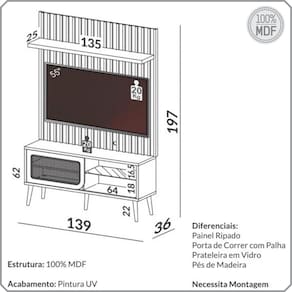 Estrutura em 100% MDF 15mm, tampo e base em MDF 24mm, laterais MDF 25mm.