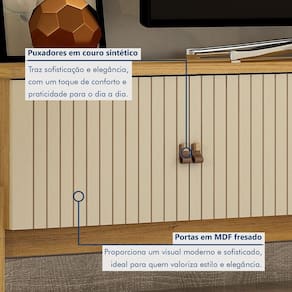 É um rack para sala pequena? Sim, ele se adapta perfeitamente a salas pequenas e também é uma ótima opção para decorar salas maiores. Produto Montado: Sim Acabamento: Pintura Acabamento da Porta: Pintura Acabamento da Prateleira: Pintura Acabamento dos Pés: Pintura Altura dos Pés: 31,5 cm Altura Máxima dos Pés: 31.5000 Ambiente Principal: Sala de Estar codigo_ean: 7900288055538 Complexidade da Montagem: Alta: deve ser montado por um montador especializado Cor: Cinamomo/Off White Cor do Produto: Cinamomo/Off White Escala de Brilho: Fosco Escala de Brilho da Porta: Fosco Escala de Brilho da Prateleira: Fosco Estilo do Pé: Moderno Ideal para TVs até (Polegadas): 55 Itens Inclusos: 1 Rack + Manual de Instrução. Linha ou Coleção: Ouro Preto Manual de Montagem e Instalação: https://product-hub-prd.madeiramadeira.com.br/975330/documents/67e56dd0-696d-4eb8-a616-4f24b49ff0cd264458973217375548174235.pdf Marca: Valdemóveis Material da Porta: MDF Material da Prateleira: MDP Material do Puxador da Porta: Couro Material dos Pés: MDP Material Principal: MDF/MDP Modelo de Porta: Porta Ripada Necessita Montagem: Sim Peso: 32,6 kg Peso Máximo por Prateleira: 10 kg Possui Espelho: Não Possui iluminação: Não Possui Pés: 05 Possui Prateleiras: Sim Quantidade de Nichos: 01 Recomendações de Uso, Manutenção e Limpeza: Recomendamos que a limpeza seja feita apenas com pano umedecido. Sapatas Niveladoras: Não Sistema de Montagem: Parafusos Tipo de Dobradiça/Corrediça da Porta: Metálica Tipo de Porta: Bater Tipo de Puxador da Porta: Externo Tipo de Rack: Rack Moderno