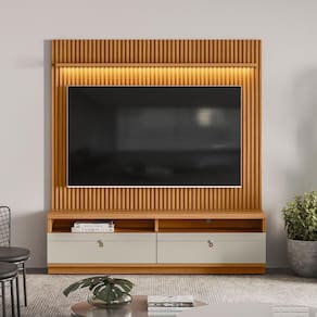 Suporta TV de até 75 polegadas no painel, 70 polegadas na bancada.