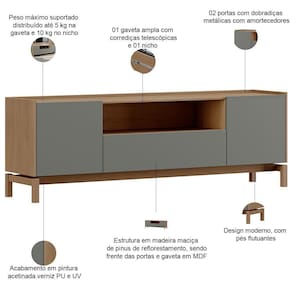 Cor: Oak Ferrolack | Formato do móvel: Rack | Altura: 60 cm | Material da estrutura: Madeira Maciça | Largura: 180 cm | Profundidade: 40 cm | Tamanho máximo de TV: 50 Polegadas | Quantidade de portas: 2 | Quantidade de gavetas: 1 | Requer montagem: Sim | Com compartimento para alto-falantes: Não | Com rodas: Não | Peso: 39 Kg | Materiais do corpo: Madeira Maciça | Material das corrediças: Metálicas