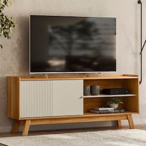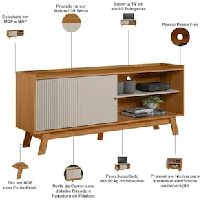 Com uma porta de correr com detalhes frisados, esse rack para TV 65 polegadas combina praticidade com um design leve e atemporal. A prateleira é ideal para exibir suas peças favoritas ou aparelhos eletrônicos, enquanto os nichos oferecem espaço para manter tudo organizado de forma linda e agradável. Já os pés em MDF garantem estabilidade e um visual retrô. Um móvel que vai transformar sua sala de estar, levando equilíbrio entre o prático e o estiloso, com um toque de criatividade!
