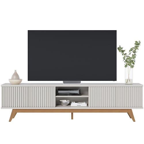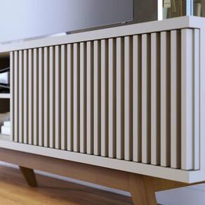O Rack para Sala De Estar TV 75 Pol 218cm Aracaju C04 Off White Matte, da Lyam Decor, é perfeito para quem busca um móvel moderno e funcional. Com seu design contemporâneo, ele pode acomodar uma TV de até 75 polegadas. Já o destaque fica por conta das 4 portas com ripados artesanais que trazem delicadeza e refinamento ao ambiente, assim como seus pés de madeira maciça estilo retrô que agrega charme. Para garantir ainda mais funcionalidade, o nicho central é perfeito para armazenar dispositivos eletrônicos de forma prática e organizada sem deixar fios aparentes.