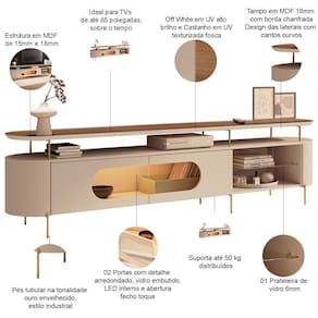 Seu design curvo e pés tubulares metálicos criam um equilíbrio único, enquanto a tonalidade ouro agrega um toque de sofisticação. Já as portas arredondadas com vidro embutido, a prateleira lateral em vidro e as laterais curvas completam o visual deslumbrante, ao passo que une funcionalidade e estilo em um só móvel. E tudo isso em 100% MDF, garantindo durabilidade e elegância. Em outras palavras, uma rack bancada perfeito para valorizar sua sala de estar. O Rack Sâmia é mais que um móvel, é uma declaração de bom gosto! Adicione ao seu carrinho e aproveite!