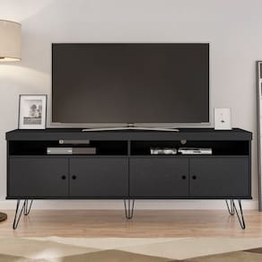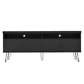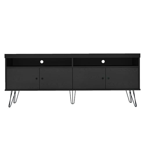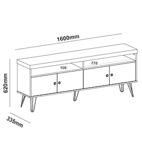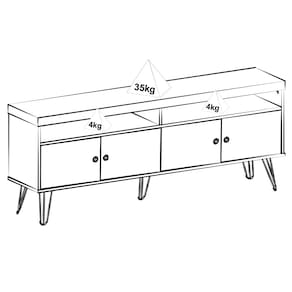 Características adicionais: Tampo em Tamburato de 50mm que suporta TVs até 65 polegadas, 2 passa fios, 4 portas com dobradiças metálicas, Amplo espaço para objeto e eletrônicos, 5 pés metálicos