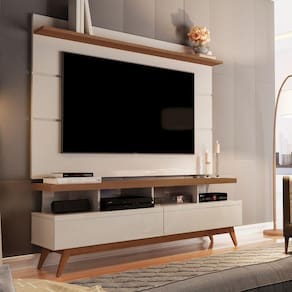 CARACTERÍSTICAS DO PRODUTO - MDP /MDF - Gavetas com corrediças telescópicas para organizar objetos pessoais - Nicho para acomodar seus aparelhos eletrônicos - Prateleira superior em MDP - Detalhe de frisos no rack - Pés em madeira maciça - Fixação na parede através de réguas - Ideal para TV de até 65” - Suporta até 20 Kg