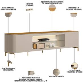 O painel para TV, com seus detalhes curvos canelados, suporta TVs de até 85 polegadas. Já o rack bancada, com tampo em MDF e pés metálicos dourados que evocam o charme industrial, complementa a elegância do ambiente. Os nichos centrais com LED, além de embelezar com um toque único, também são ideais para organizar aparelhos eletrônicos e itens decorativos, enquanto as fitas de LED nas laterais do painel adicionam um toque mágico à sua sala, criando um espaço acolhedor para momentos especiais.