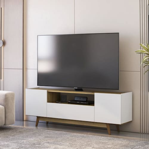 O rack para TV até 72 polegadas Porto Belo da Mademóvel é o móvel ideal para deixar sua sala de estar de cara nova com mais elegância e modernidade! Possui 2 portas com interior bem espaçoso e uma gaveta. Possui pés estilo retrô que trazem requinte ao ambiente. Produto Montado: Sim Acabamento: Finish Foil Acabamento da Porta: Finish Foil Acabamento dos Pés: Melamínico Altura dos Pés: 17 cm Altura Máxima dos Pés: 17.0000 Ambiente Principal: Sala de Estar codigo_ean: 7900288284273 Complexidade da Montagem: Média: pode ser montado por mais de uma pessoa e/ou necessite de maior conhecimento para montagem Cor: Branco/Mel Cor do Produto: Branco/Mel Cor Flex: Não Cor Interna: Branco/Mel Escala de Brilho: Fosco Escala de Brilho da Porta: Fosco Espessura do Tampo: 15 mm Estilo do Pé: Retrô Ideal para TVs até (Polegadas): 72 Itens Inclusos: 1 Rack, Kit Ferragem e Manual de Montagem Linha ou Coleção: Porto Belo Manual de Montagem e Instalação: https://product-hub-prd.madeiramadeira.com.br/271201069/documents/24eb6348-7256-4e55-9421-9623cec57af0330884152251761942478959.pdf Marca: Mademovel Material da Porta: MDP Material dos Pés: PVC Material Principal: MDP Modelo de Porta: Porta Lisa Montagem Flex: Não Necessita Montagem: Sim Origem do Produto: Nacional Peso: 31,83 kg Possui Adega: Não Possui Espelho: Não Possui iluminação: Não Possui Passa Cabos: Não Possui Pés: 04 Possui Prateleiras: Não Possui Vidro: Não Recomendações de Uso, Manutenção e Limpeza: Para a limpeza do móvel utilizar pano levemente umedecido com água e sabão neutro Sapatas Niveladoras: Não Sistema de Montagem: Parafusos e cavilhas Tipo de Dobradiça/Corrediça da Porta: Metálica Tipo de Porta: Misto (Bater e Basculante) Tipo de Puxador da Porta: Embutido Marca: Não Informado