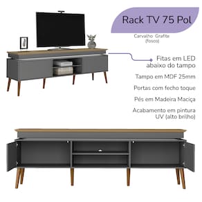 Escolha ideal para quem busca um móvel moderno, funcional e com acabamento impecável. Com design contemporâneo, o Rack acomoda TVs de até 75 pol. Seu tampo em MDF de 25mm com borda invertida garante resistência, enquanto a fita LED embutida abaixo do tampo oferece uma iluminação suave e decorativa, também acompanha 2 metros de fio para fácil conexão à tomada. Sua estrutura é feita em MDP de 15mm, unindo leveza e durabilidade. Já os pés, em madeira maciça trazem firmeza e um toque natural ao móvel. Conta ainda com duas portas com fecho toque, que dispensam puxadores e valorizam o visual clean, além de dois nichos centrais. Este móvel chegará em sua casa separado em 01 volume.