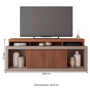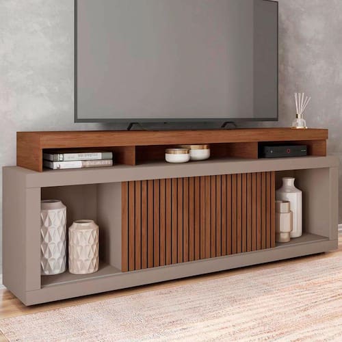 O(a) Rack para TV 75 Polegadas 2 Portas com Ripado Aegon Cinza/Havana - Caemmun é produzido em MDF e MDP na escala de brilho Fosco, e possui um grau de dificuldade de montagem: Médio.