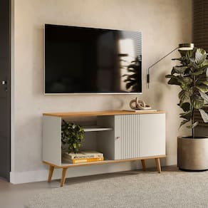 Seu design contemporâneo combina a sofisticação do acabamento Nature/Off White com detalhes em frisos e um puxador na cor cobre, adicionando um toque de modernidade e charme ao ambiente. O tampo em MDP de 15mm garante durabilidade e resistência para suportar o peso da TV e demais objetos.