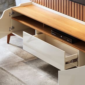 2 portas em Mdf 15mm com bordas laqueadas ; Gaveta central em MDF 15mm com bordas laqueadas e corrediças telescópica; Tampo e Base em Mdp 15mm; 1 pé central com sapata regulável. Acabamento: Pintura UV Acabamento da Gaveta: Pintura UV Acabamento da Porta: Pintura UV Acabamento da Prateleira: Pintura UV Acabamento dos Pés: Verniz Altura dos Pés: 15 Ambiente Principal: Sala de Estar Complexidade da Montagem: Média: pode ser montado por mais de uma pessoa e/ou necessite de maior conhecimento para montagem Cor: Off White/Marrom Cor do Produto: Off White/Marrom Cor Flex: Não Cor Interna: Off White Escala de Brilho: Brilhante Escala de Brilho da Gaveta: Brilhante Escala de Brilho da Porta: Brilhante Escala de Brilho da Prateleira: Brilhante Gaveta com Chave: Não Ideal para TVs até (Polegadas): 60 Itens Inclusos: 1 Rack, Kit Ferragens e Manual de Montagem Linha ou Coleção: Studio Manual de Montagem e Instalação: https://product-hub-prd.madeiramadeira.com.br/907222/documents/0a33cb7f-2b28-4ceb-b40a-a026807bb4ce1943536108917153598828052.pdf Material da Gaveta: MDF/MDP Material da Porta: MDF/MDP Material da Prateleira: MDP Material dos Pés: Madeira Maciça Material Principal: MDF/MDP Montagem Flex: não Necessita Montagem: Sim Origem do Produto: Nacional Peso: 41,2 kg Peso Máximo por Gaveta: 5 Peso Máximo por Prateleira: 10 Possui Adega: Não Possui Espelho: Não Possui Possui iluminação: Não Possui Pés: 05 Possui Portas: 02 Possui Prateleiras: 01 Possui Vidro: Não Quantidade de Gavetas: 01 Gaveta Quantidade de Nichos: 01 Recomendações de Uso, Manutenção e Limpeza: Pano seco Sapatas Niveladoras: Sim Sistema de Montagem: parafusos, cavilhas, dobradiças, corrediças, minifix, pregos, sapata e tapa furos. Tipo de Corrediça da Gaveta: Metálica Telescópica Tipo de Dobradiça/Corrediça da Porta: Metálica Tipo de Madeira Maciça dos Pés: Pinus Tipo de Porta: Bater Tipo de Puxador da Gaveta: Embutido Tipo de Puxador da Porta: Embutido Tipo de Rack: Rack com Gaveta