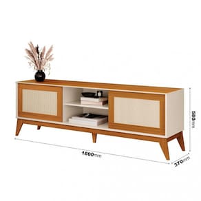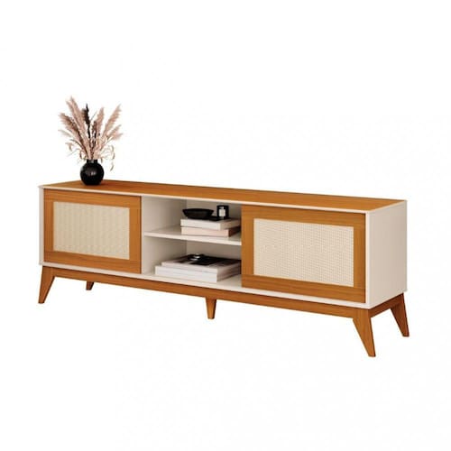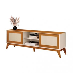 Características: Estrutura em MDP Tampo em MDF 2 Portas deslizantes Trilhos em ABS 1 Prateleira Acabamento em tela Rathan Sintético Pés em MDF Suporta TVs até 65 Polegadas