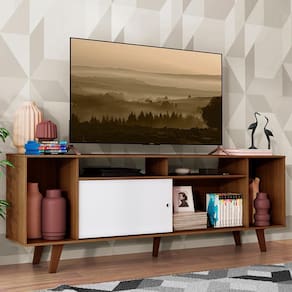 O tamanho é ótimo, comportando TV de até 65 polegadas. Possui nichos de espaços variados, entre abertos e fechados. Assim, cabe tudo de maneira organizada, desde aparelhos eletrônicos até objetos de decoração, livros e revistas.