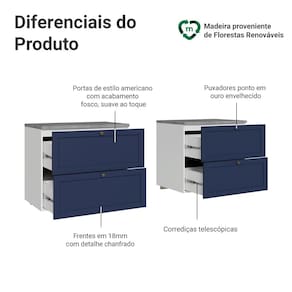 O acabamento de alta resistência da estrutura é em Branco e das frentes em Azul, possuindo uma textura suave ao toque. O destaque fica por conta dos puxadores ponto em ouro envelhecido, feitos com metal resistente, trazem personalidade e um charme único. O detalhe chanfrado das frentes forma molduras delicadas e atemporais.
