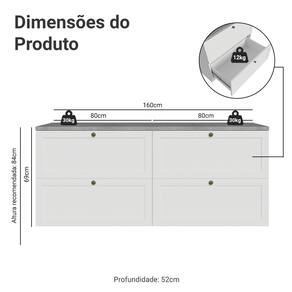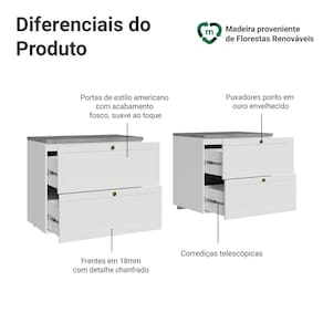 O acabamento de alta resistência da estrutura e das frentes é em Branco, possuindo uma textura suave ao toque. O destaque fica por conta dos puxadores ponto em ouro envelhecido, feitos com metal resistente, trazem personalidade e um charme único. O detalhe chanfrado das frentes forma molduras delicadas e atemporais.
