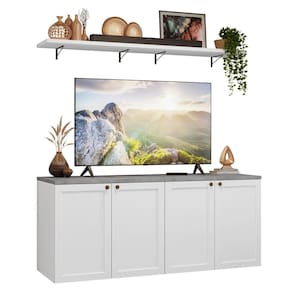 O conjunto é composto por um rack com quatro portas no total, complementado por prateleiras suspensas que proporcionam espaço extra para decoração e organização. As portas contam com dobradiças com amortecimento, garantindo um fechamento suave e silencioso. Além disso, o rack oferece amplo espaço interno para armazenar equipamentos eletrônicos e outros itens, mantendo a sala sempre em ordem.