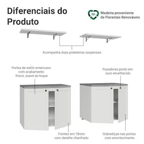 O acabamento de alta resistência da estrutura e das frentes é em Branco e possui uma textura suave ao toque. O destaque fica por conta dos puxadores ponto em ouro envelhecido, feitos com metal resistente, trazem personalidade e um charme único. O detalhe chanfrado das frentes forma molduras delicadas e atemporais, no estilo americano.