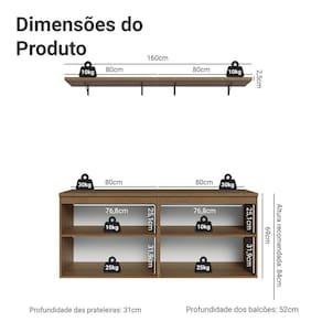 - 31 cm de profundidade nas prateleiras e 52cm nos balcões