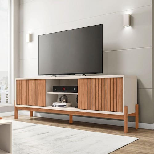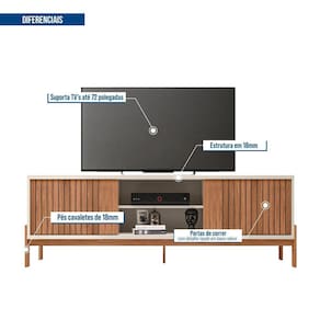 O Rack Sparta é a opção perfeita para quem procura um móvel elegante e durável para a sala de estar. Os pés de cavalete em 18 mm dá um toque de estilo ao móvel, enquanto o acabamento em madeira é atemporal e sofisticado. Com 1.8 m de largura e capacidade para TVs de até 72 polegadas, o que a torna ideal para a maioria das salas. A porta de correr com detalhe ripado acrescenta modernidade ao design, se tornando perfeita para você. Produto Montado: Sim Acabamento: Pintura UV Acabamento da Porta: Pintura UV Acabamento da Prateleira: Pintura UV Acabamento dos Pés: Pintura Altura dos Pés: 5 Altura Máxima dos Pés: 5.0000 Ambiente Principal: Sala de Estar codigo_ean: 7909903494936 Complexidade da Montagem: Média: pode ser montado por mais de uma pessoa e/ou necessite de maior conhecimento para montagem Cor: Freijó/Off White Cor do Produto: Freijó/Off White Cor Flex: Não Cor Interna: Freijó Escala de Brilho: Fosco Escala de Brilho da Porta: Fosco Escala de Brilho da Prateleira: Fosco Ideal para TVs até (Polegadas): 72 Itens Inclusos: 1 Rack, Kit Ferragens e Manual de Montagem Manual de Especificação Técnica: https://product-hub-prd.madeiramadeira.com.br/878210/documents/17ac8df9-f7b7-4439-bb24-b131c3898ace1648744ftbancadatannen.pdf Manual de Montagem e Instalação: https://product-hub-prd.madeiramadeira.com.br/878210/documents/44bf7ece-bfea-4a6b-ba20-ca003376b8521672177eqbancadatanneneda.pdf Material da Porta: MDF Material da Prateleira: MDP Material do Puxador da Porta: MDP Material dos Pés: MDP Material Principal: MDP Montagem Flex: Não Necessita Montagem: Sim Origem do Produto: Nacional Peso: 35,5 kg Peso Máximo por Prateleira: 10 kg Possui Adega: Não Possui Espelho: Não Possui iluminação: Não Possui Pés: 05 Possui Portas: Sim Possui Prateleiras: Sim Possui Vidro: Não Quantidade de Nichos: 04 Recomendações de Uso, Manutenção e Limpeza: Limpar com pano macio levemente umedecido e em seguida pano macio seco. Não utilizar produtos abrasivos (lixas, esponjas) e/ou produtos a base de solventes (thinner, aguarrás). Sapatas Niveladoras: Sim Sistema de Montagem: Utiliza-se na montagem do produto sistema de fixação minifix, dispositivos angulares, cavilhas, parafusos, porcas cilindricas, entre outros; Tipo de Porta: Correr Tipo de Puxador da Porta: Embutido Tipo de Rack: Rack Baixo