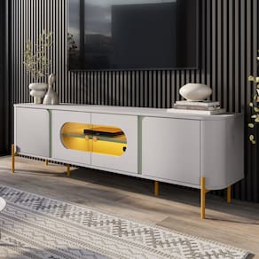 O(a) Rack para TV Até 75 Polegadas Evans 4 Portas com Vidro e Led Off White/Pistache - Pnr Móveis é produzido em MDP na escala de brilho Brilho, e possui um grau de dificuldade de montagem: Médio.