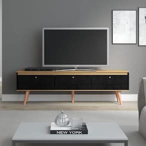 Material: MDP Acabamento: Pintura UV Espessura da estrutura: 15 mm Portas: 3 portas basculantes de abertura vertical com amortecedores Material das dobradiças: Metálicas Rack com pés em madeira pinus, com caixa e frentes em 15 mm