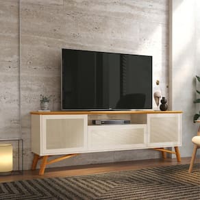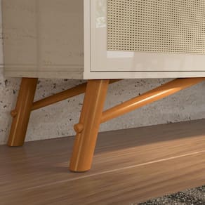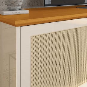 Te apresento nosso Rack Rattan! Com estrutura completa para deixar sua sala de estar bem-organizada e com um visual moderno. Nosso Rack foi desenvolvido para você que procura bom gosto e qualidade. Elaborado em material MDF e MDP com acabamento em pintura UV, possui 3 portas com acabamento em Rattan, sendo a porta central do modelo basculante com ótimo espaço para auxiliar na organização do seu ambiente. Além dos compartimentos internos, você também tem disponível o tampo amplo, e juntos eles vão acomodar os eletrônicos e aqueles outros objetos de decoração. Para garantir ainda mais qualidade e durabilidade os pés do Rack Rattan são em madeira maciça trazendo mais resistência ao móvel.