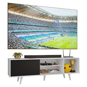 Na parte de trás, a abertura para passagem dos fios facilita a organização dos cabos. O acabamento apresenta a estrutura e os pés brancos, combinados com a porta preta, criando um contraste elegante e moderno para a sala de estar.