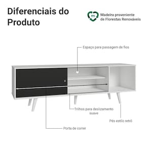 Com design contemporâneo, o móvel conta com uma estrutura moderna e funcional, três nichos em diferentes tamanhos e uma porta de correr, ideais para organizar eletrônicos, livros ou objetos decorativos. Também oferece espaço para TVs de até 80 polegadas.