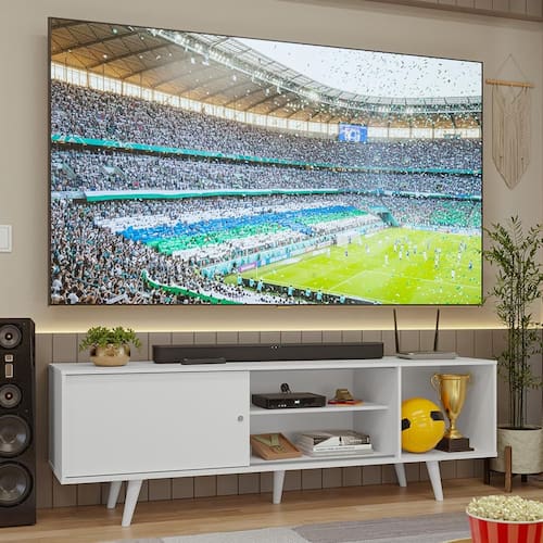 Na parte de trás, a abertura para passagem dos fios facilita a organização dos cabos. Os pés garantem charme e estabilidade. O acabamento branco traz leveza ao ambiente, combinando facilmente com diferentes estilos de decoração. Um móvel funcional e cheio de charme perfeito para renovar sua sala de estar.