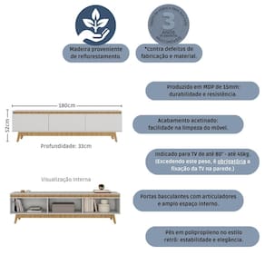 Dimensões do Produto Montado: Altura: 52cm | Largura: 180cm | Profundidade: 33cm *Você pode consultar as medidas detalhadas na imagem técnica do produto. *Devido às variações de tamanho dos televisores no mercado, sugerimos que compare o tamanho da sua TV com o rack antes de efetuar a compra.