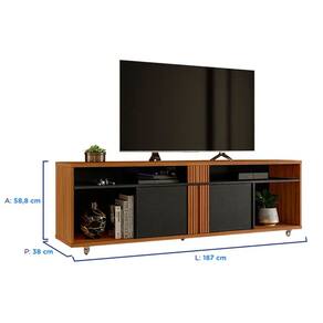 Características: Marca: Notável Modelo: NT 1290 Tipo: Rack Ideal para TVs até: 70 Polegadas Quantidade de portas: 2 portas Quantidade de prateleiras: 1 prateleira Tipo de dobradiças: Com amortecimento Material da estrutura: MDP e MDF Material dos puxadores: MDF Espelho: Não Acabamento: Pintura UV Escala de brilho: Fosco Material dos pés: Silicone Quantidade de pés: 5 Altura dos pés: 6,5 cm Dimensões: Altura: 58,8 cm Largura: 180 cm Profundidade: 38 cm Peso: 39,65 kg Peso máximo suportado por prateleiras: 15 kg Peso máximo suportado: 55 kg