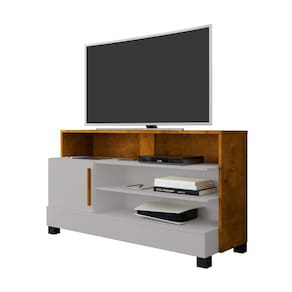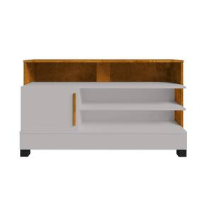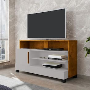 Seu design compacto conta com 1 porta com puxador em MDF, além de 4 nichos externos, 1 interno e 2 prateleiras, garantindo organização inteligente para consoles, livros, decodificadores e outros itens.