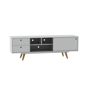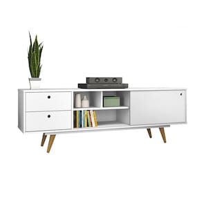 Rack Retrô 85, possui porta deslizante em MDF, prateleira interna e compartimentos abertos para acomodação de diversos objetos. Possui pés palito em madeira envernizados trazendo o design retrô. Os produtos da Olivar Móveis não servem apenas para preencher os espaços da sua casa, mas sim para transformar em um lugar aconchegante, atraente e com um design moderno, sem abrir mão da qualidade.