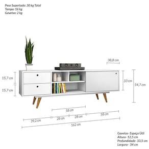 - Tamanho: Grande - Formato do Móvel: Rack - Peso do Produto Montado: 368 - Peso Máximo Suportado: 30 - Medida do Produto Montado (LXCXA): 38,5cmX162cmX54,7cm - Acabamento: Pintura UV - Escala de Brilho: Acetinado - Material da Estrutura: MDP de 15mm e MDF de 15 e 25mm - Produto Necessita de Montagem?: Sim - Quantidade de Gaveta: 2 - Tipo de Gaveta: Com Corrediça de Roldana - Quantidade de Pés: 4 - Tipo de Pés: De Madeira - Quantidade de Portas: 1 - Tipo de Porta: De Correr - Quantidade de Prateleiras: 5 - Tipo de Prateleira: Fixa - Quantidade de Nichos: 2 - Recomendações de manutenção: Pano úmido. Não aplicar lustra móveis - Tamanho Máximo da Tv: Até 60 Polegadas - Volumes: 1 - Garantia: 3 Meses