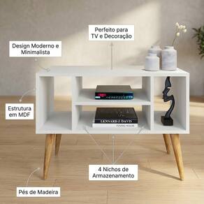 Rack Retrô Branco Para Tv Home Estante 4 Nichos Pés Madeira