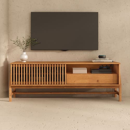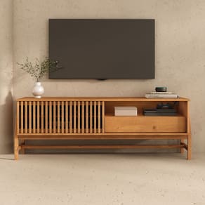 Feito de madeira. Feito para durar. O Rack Adamo combina o melhor do design contemporâneo com a autenticidade da madeira natural. Feito inteiramente em madeira maciça, ele revela veios e nuances únicas que tornam cada peça exclusiva — um verdadeiro destaque na decoração da sala. Seu desenho minimalista é marcado pelas portas ripadas deslizantes com sistema decorrer, que dispensam puxadores e reforçam a estética limpa e elegante. O tampo amplo comporta TVs de até 75”, enquanto os nichos internos oferecem espaço funcional para eletrônicos, livros e objetos decorativos, mantendo tudo bem organizado. As gavetas com corrediças telescópicas e sistema de fecho-toque proporcionam abertura suave e total, ideais para armazenar acessórios e controles. A estrutura elevada, sustentada por pés e travessas laterais, garante leveza visual e robustez à peça, além de facilitar a limpeza do ambiente.