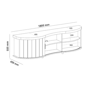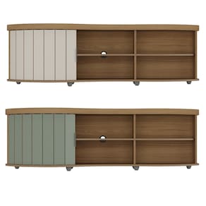 Características: 1 Porta de Correr Design orgânico, atual e exclusivo Estrutura resistente de MDF/MDP de 15mm de espessura com pintura UV Porta ripada que desliza em curva Porta reversível, a tonalidade pode ser escolhida durante a montagem Puxador de alumínio Suporta com segurança TVs de até 75 polegadas Tampo em Tamburato curvo de 50mm de espessura