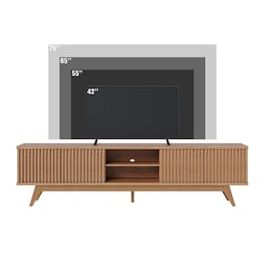 CARACTERÍSTICAS TÉCNICAS: - Produzido em MDP 15 e 25mm, MDF de 15 e 25mm e HDF de 3mm - Acabamento Fosco com Pintura UV - Portas com Ripado artesanal e Dobradiça Metálica - Pés em Madeira Maciça com 20 cm de Altura - Peso Suportado no Tampo de 40 kg - Peso Suportado na prateleira de 3kg - Ideal para TV até 75 Polegadas - Possui 4 Portas, 1 Prateleira e 2 Nichos