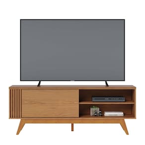 Características: Estrutura: MDP/MDF 1 Porta de Correr Tampo com detalhe chanfrado Detalhes Ripados Suporta TV até 65 Polegadas Peso suportado: 3 á 20kg Pés em madeira maciça