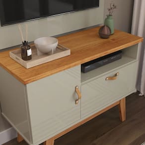 Compatível com TVs de até 32 polegadas, o modelo conta com nichos abertos para aparelhos eletrônicos e objetos decorativos, além de uma porta com bom espaço interno para organização.