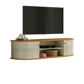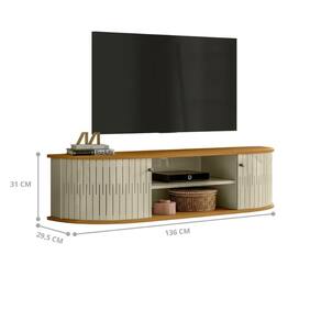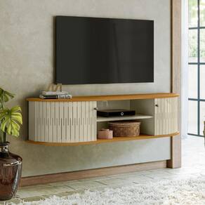 Em MDP de 15mm, Portas flexíveis em MDF, Tampo e base com detalhes curvos, Puxadores em poliestireno, Suporta TVs de até 60".