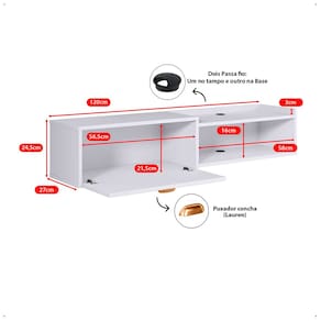 INFORMAÇÕES DO PRODUTO: * Altura: 24,5 centímetros; * Largura: 120 centímetros * Profundidade: 27 centímetros * Peso suportado: Até 15 kg distribuídos; * Produzido em MDP 15mm; * 1 Porta com dobradiças metálicas; * Puxador Concha Lauren Poliestireno Metalizado; * Nicho decorativo; * Tampo espaçoso com passa-fio; * Ripado em pintura impressa HD; * Ideal para Tv´s de até 42 polegadas;