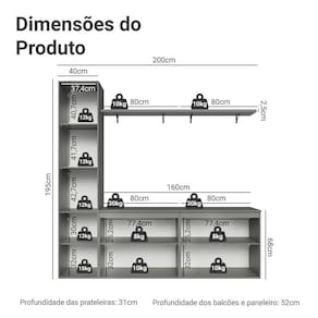 Composto por dois balcões, um armário vertical com nichos internos e duas prateleiras suspensas, o conjunto oferece espaço para de até 70 polegadas. Os módulos permitem organizar objetos e exibir itens decorativos, deixando a sala sempre em ordem. Além disso, é projetado para instalação suspensa, proporcionando um visual leve e contemporâneo